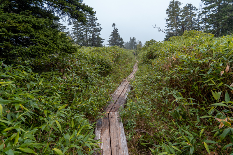 霧雨のはるか向こう、見えないトムラウシに向かって木道を進む