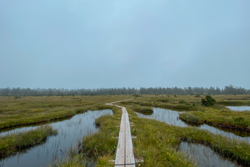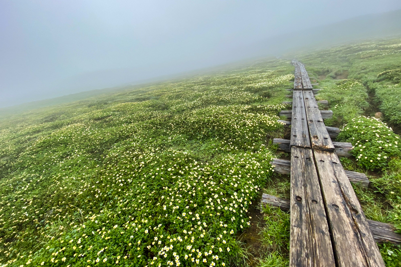 そんな錯覚を覚えるほど、霧の中を木道が延々続く