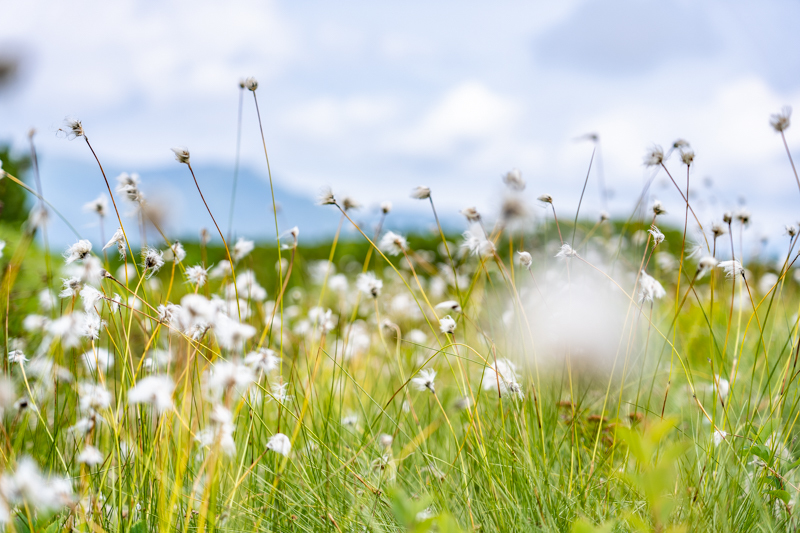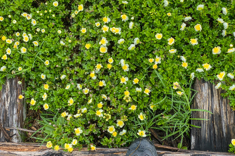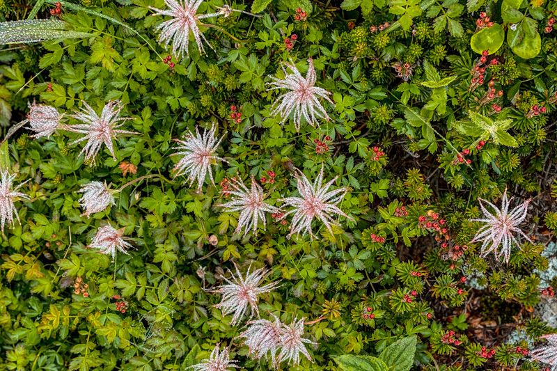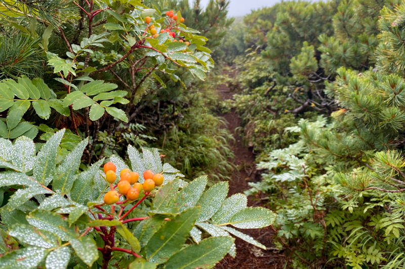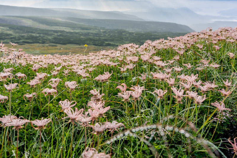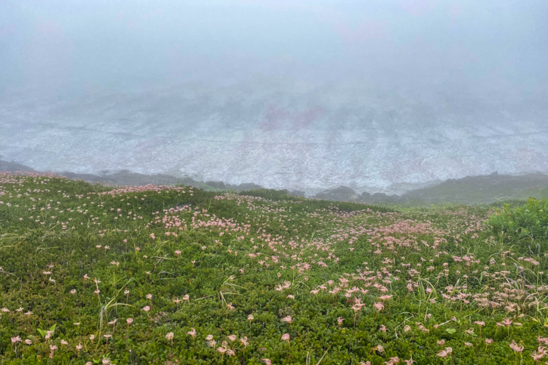 濃いガスの中、チシマノキンバイソウやチングルマ、エゾコザクラ