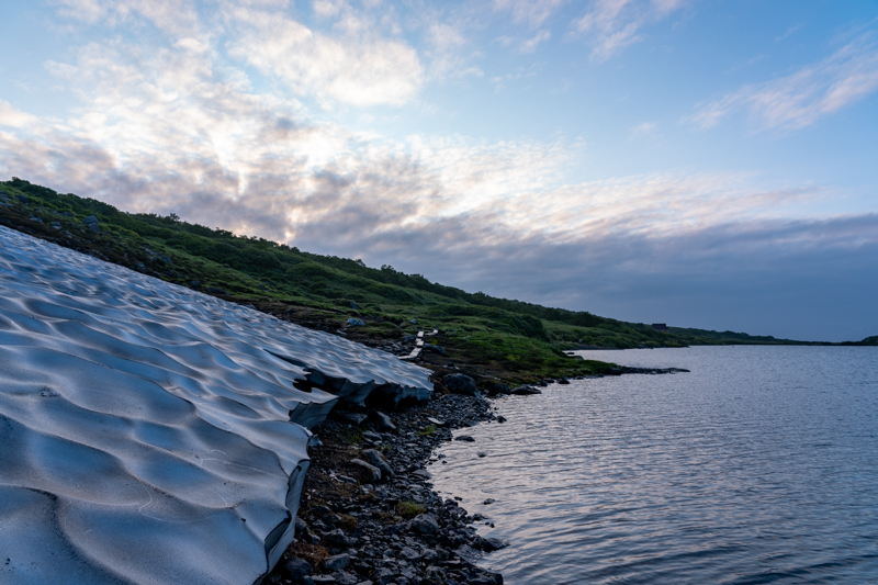 雪渓に埋もれた木道階段を沼まで下りきると、避難小屋はもうすぐそこだ
