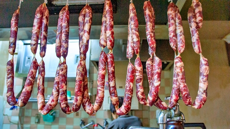 薄暗い店内には、カウンターの前にオブジェと化した腸詰がブラ下がり
