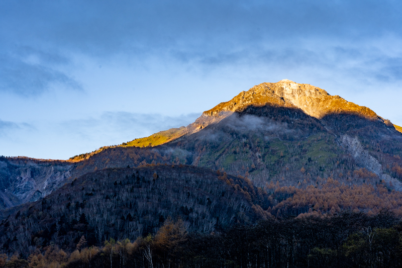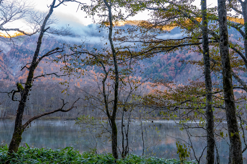 少しづつ朝陽が届きはじめ、山肌が、梢が染まって行く様にうっとり