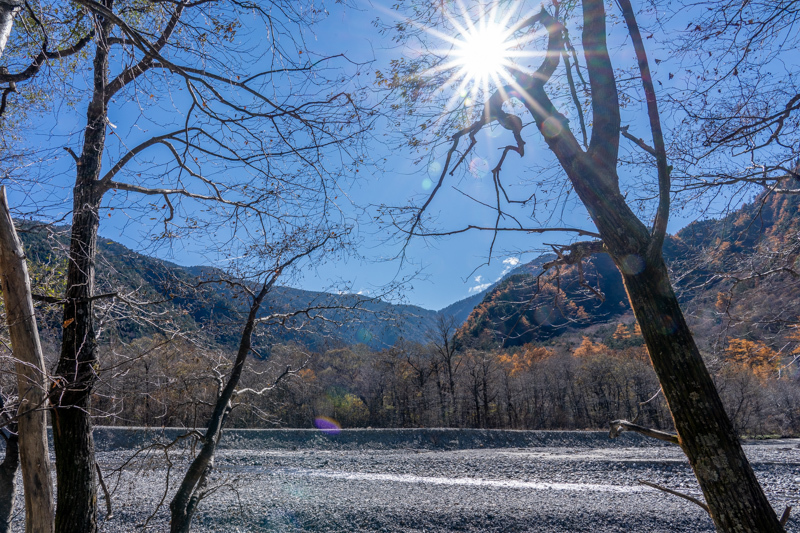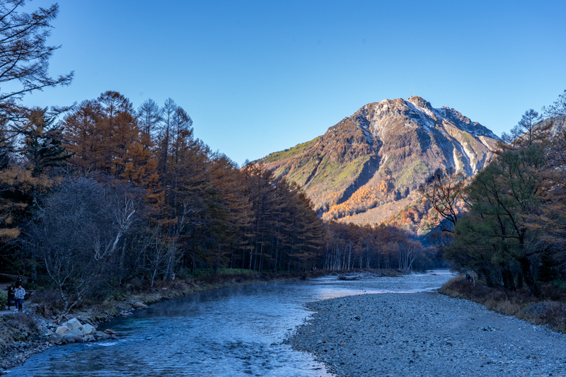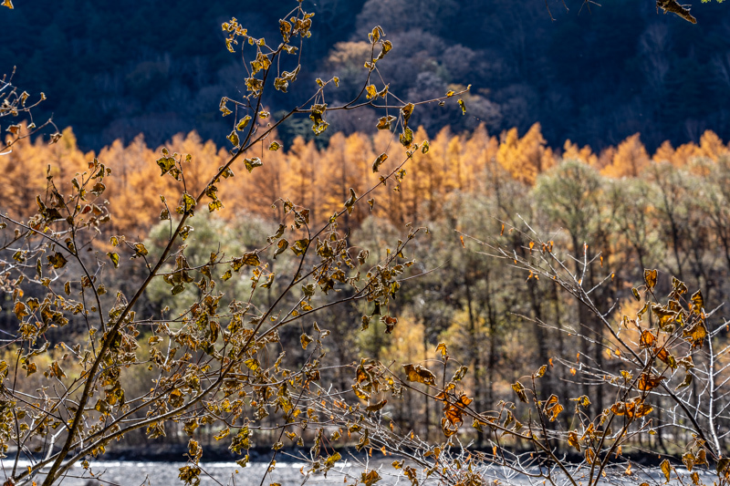 梓川は左岸の方が広く見渡せて、黄金色に輝くカラマツの中を歩けるけれど