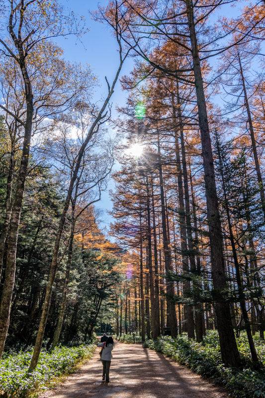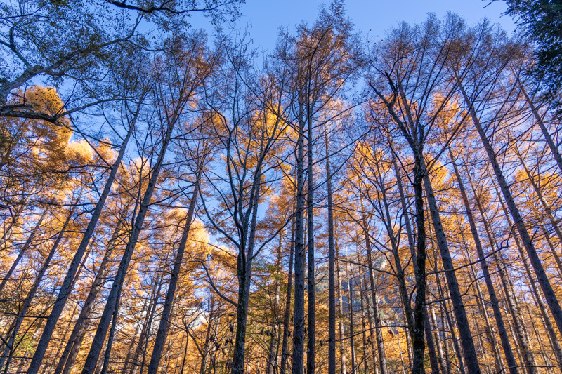 黄金色に輝く針葉樹林の中をとぼとぼ歩き