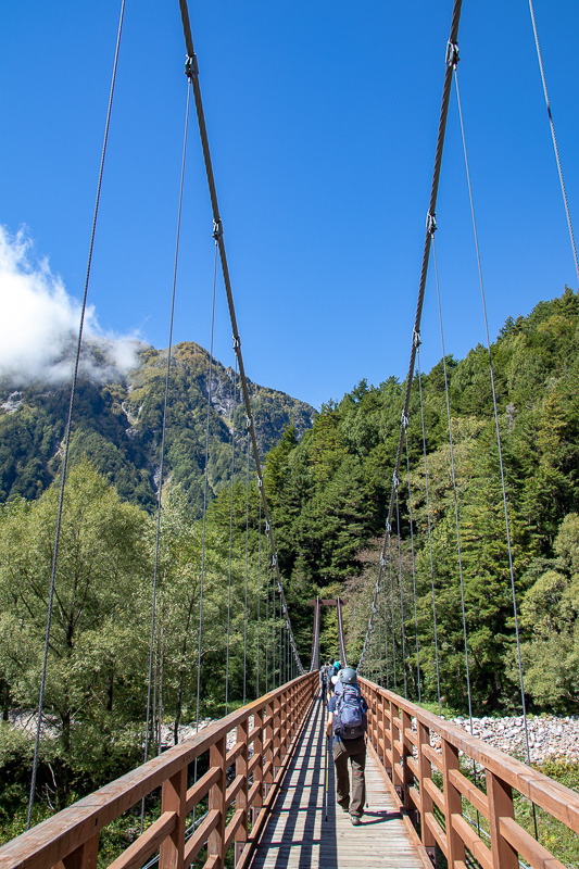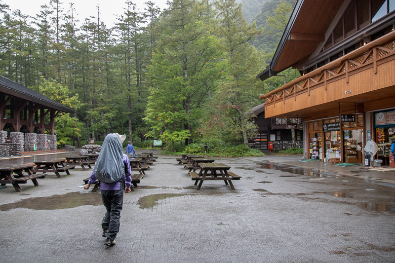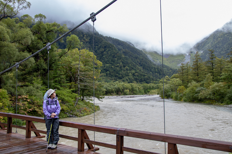 レインスーツを着込んで雨の出発、河童橋も無人で寂しそう