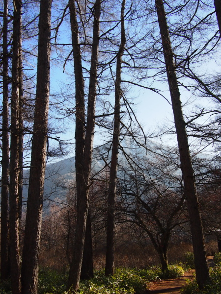 と、振り返ると唐松の梢の向こう、男体山もその頭を白くさせている