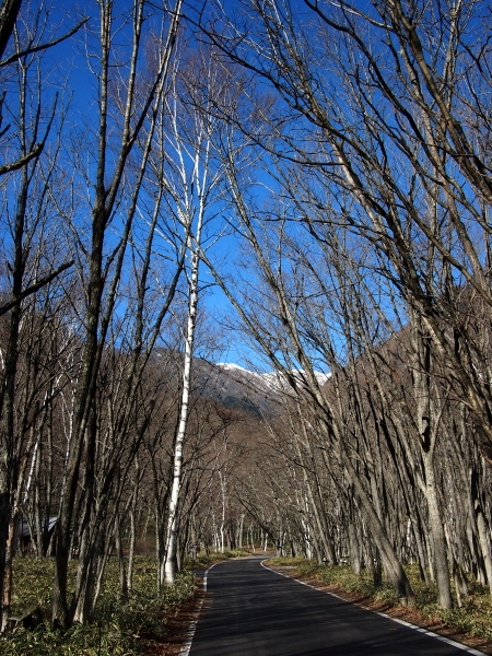 電気バス道に出ると、正面に少しだけ冠雪の白根が見える