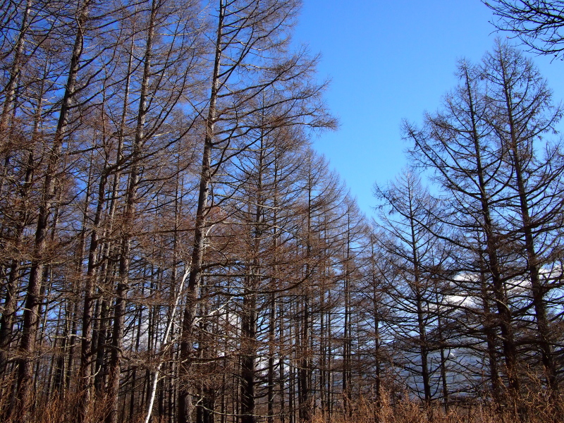 赤沼の手前の橋を渡るとき、びゅうと鳴く風に唐松の梢が揺れる