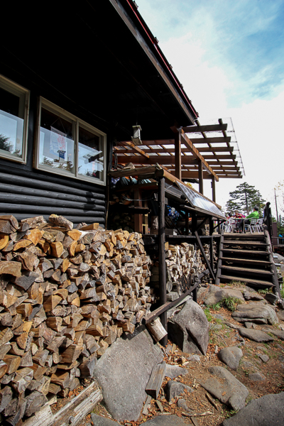 小屋の壁に高く積まれた蒔きが、秋を感じさせる