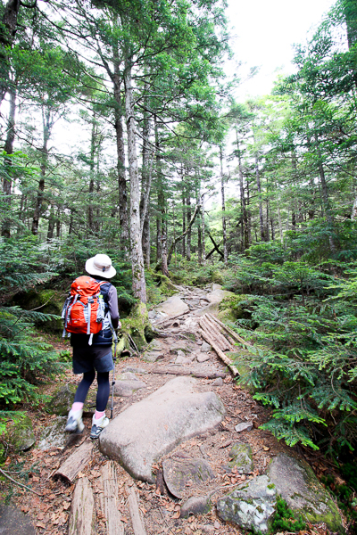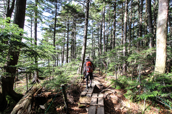 苔むしたトレイルには、シラビソやトウヒの森から木漏れ日が落ちる