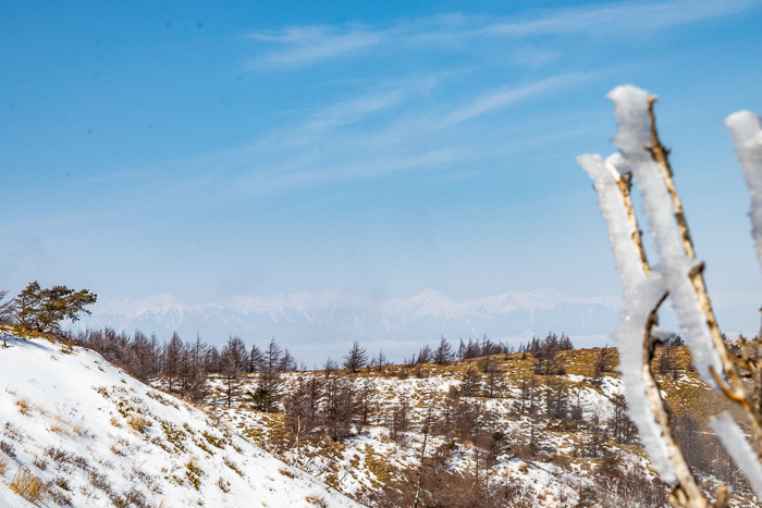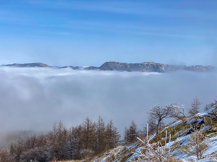 さらに登り詰めると、カラマツの梢に霧氷が見え始め
