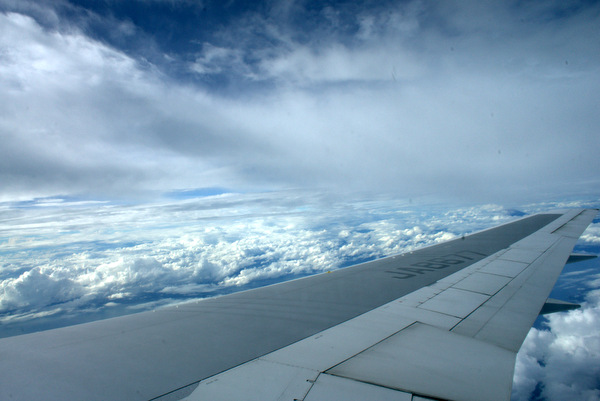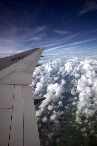 機長のアナウンスに窓の下を見下ろすと、立体的な雲のブロックが重なりあっていた