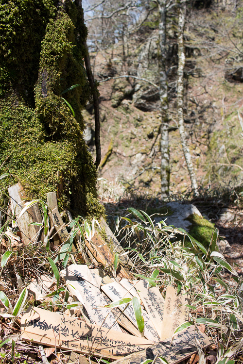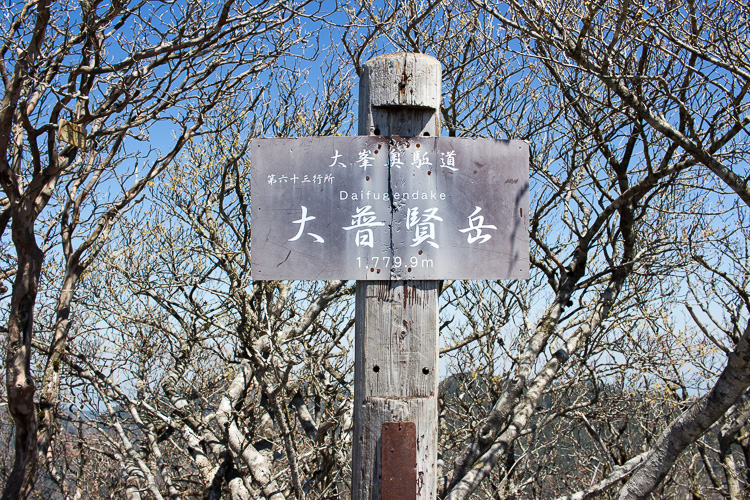 名残惜しく、奥駈道の道標を撫で、分岐を下り始めたとき