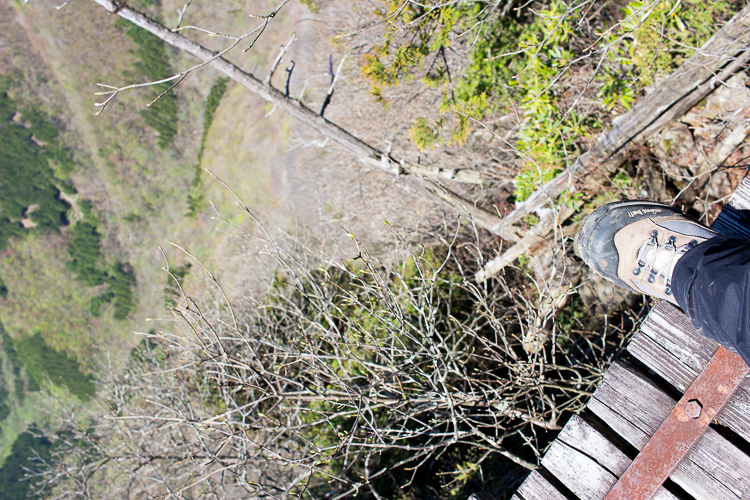 怪しい木橋を渡ると、69靡の七曜岳だ