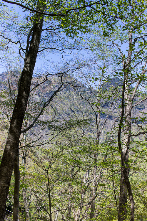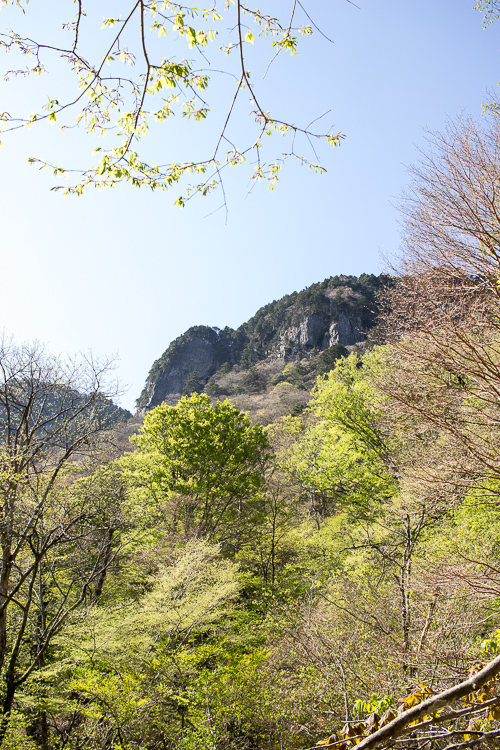 ふと見上げると新緑の向こう、大普賢岳のシルエット