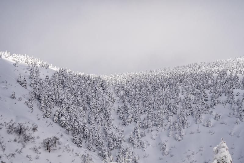 何気なくそのトレースを追って樹氷の森の奥へと下りスノモンを下から見上げ