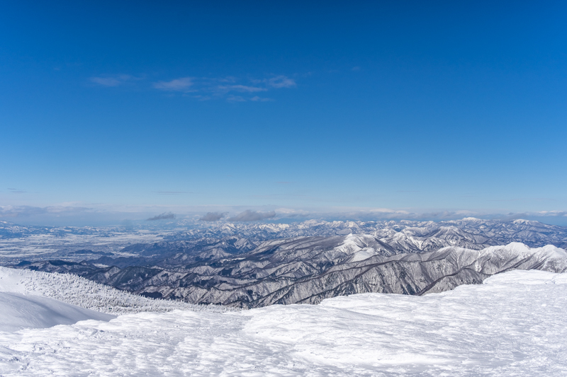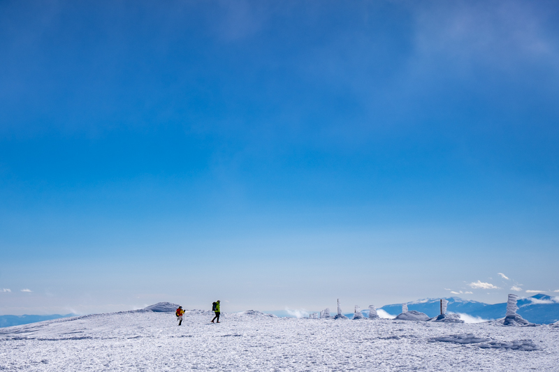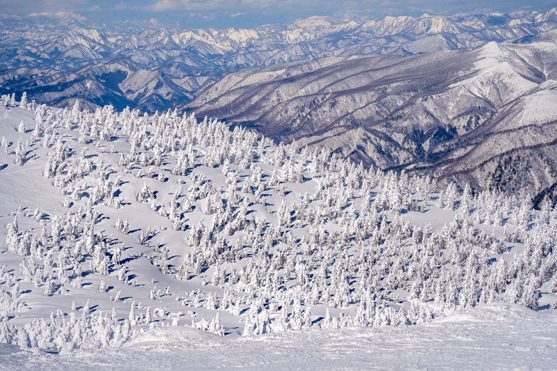 ふり返ると安達太良、吾妻連峰、そして目の前には蔵王坊平樹氷原