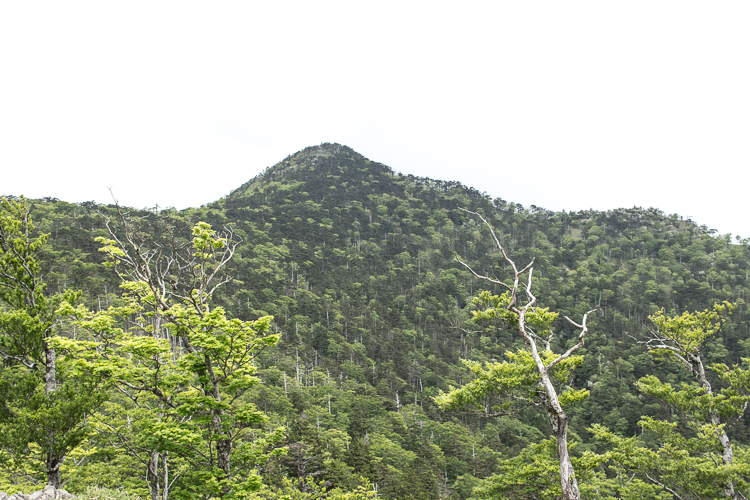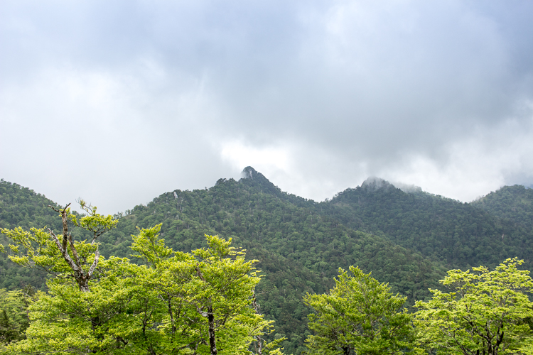 鉛色の空の下でも、釈迦ヶ岳の新緑は眩しくて