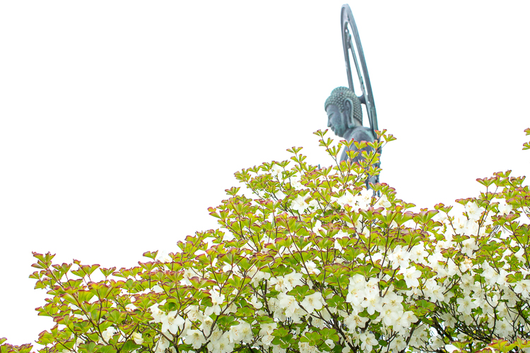 シロヤシオに囲まれたお釈迦様は笑顔で願いを叶えてくれると信じています。