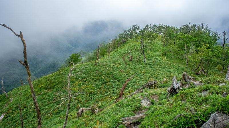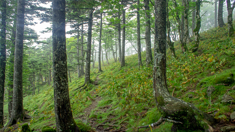 少し早足の下山、振り向き振り向き歩くけれど、最後までガスは山頂に居座っていた