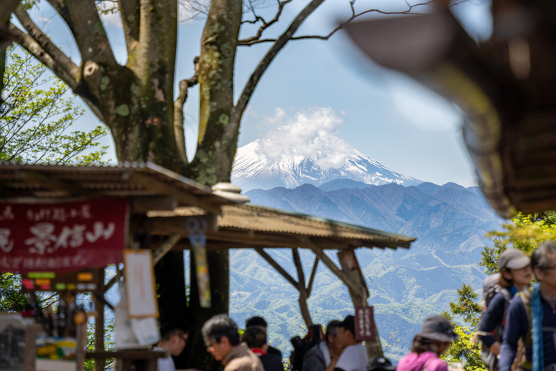 山頂からは雲海が流れて富士山も出たり隠れたり