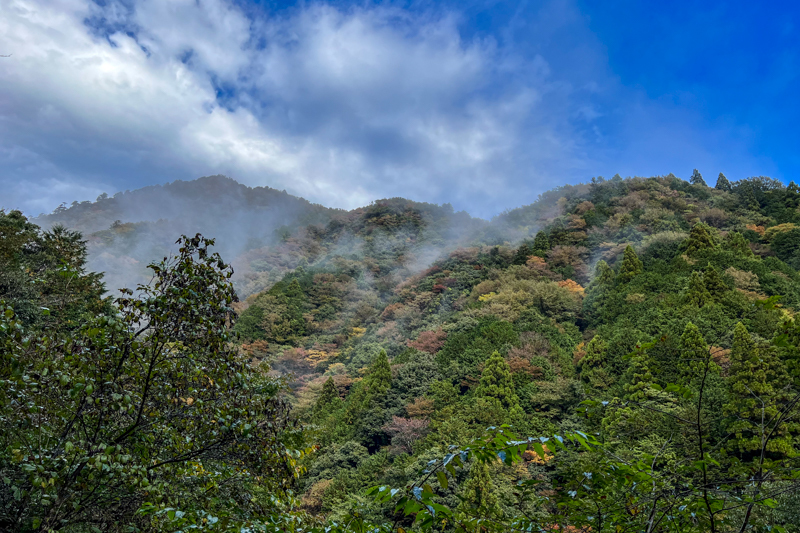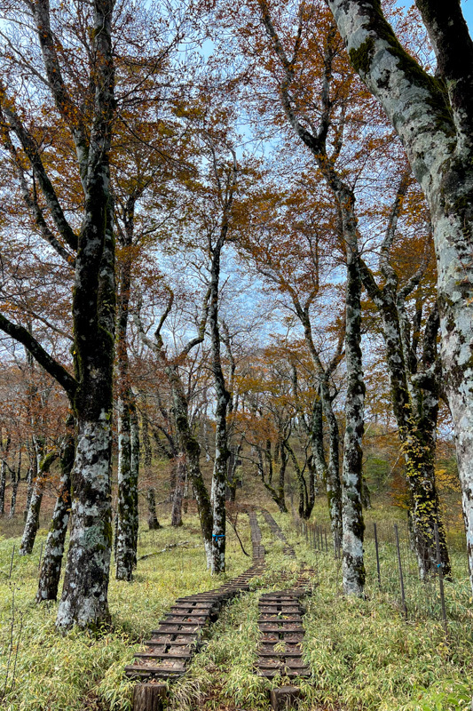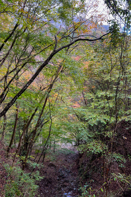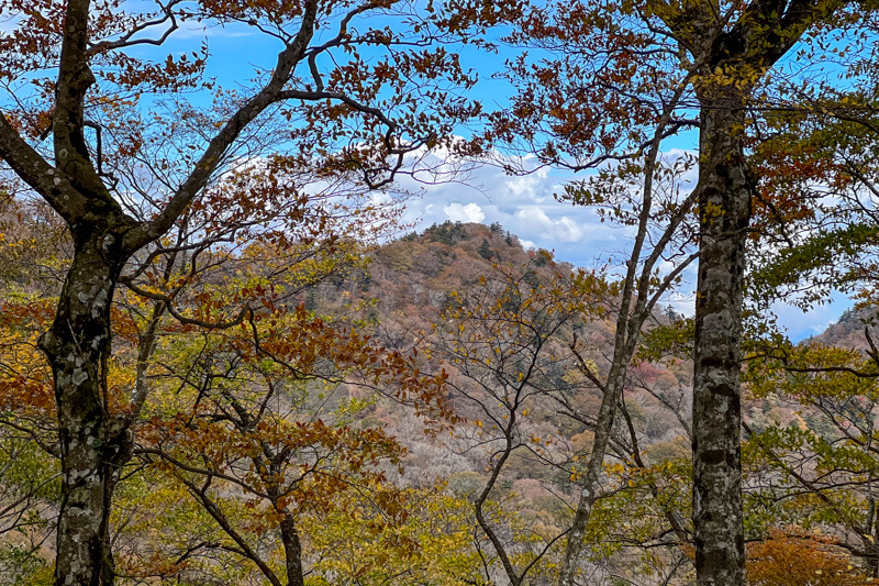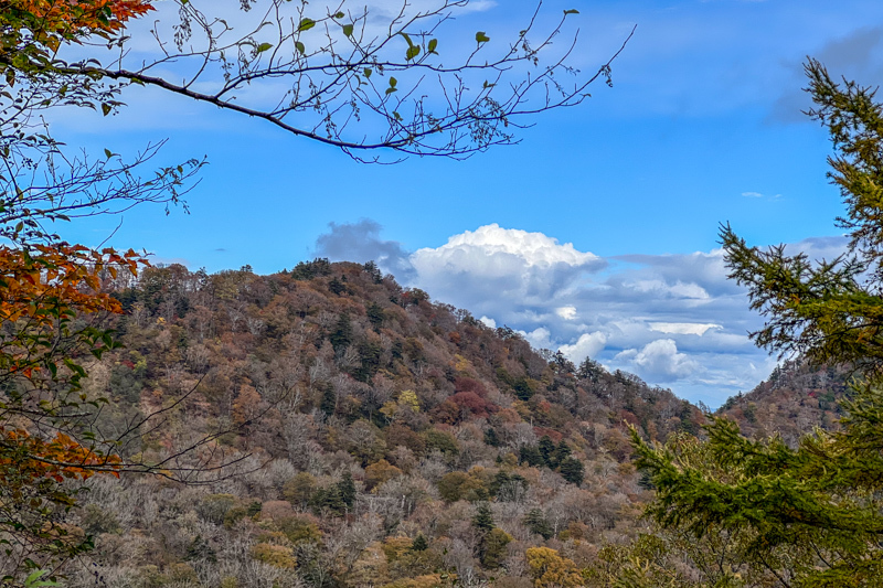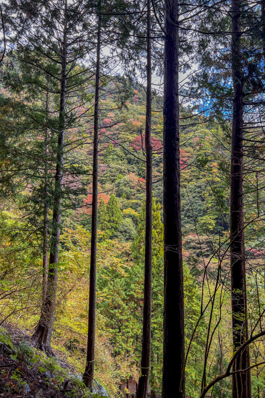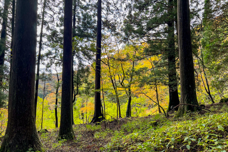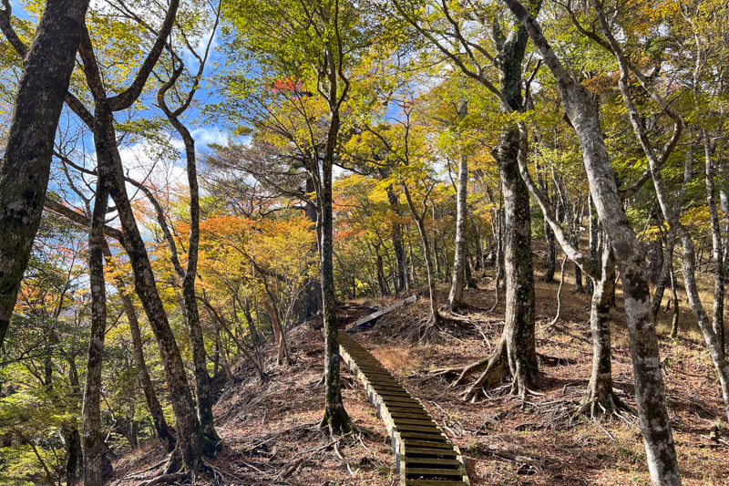 林道終点からはきちんと整備されていて歩きやすく、植林の向こうには紅葉が輝く