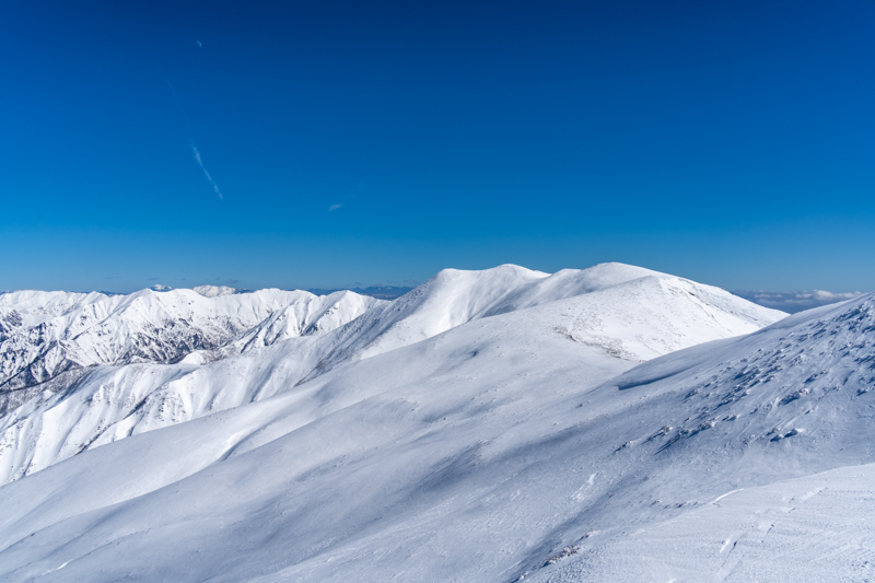 そして苗場の稜線の向こうに白い稜線が尖っている、北アルプスだ!