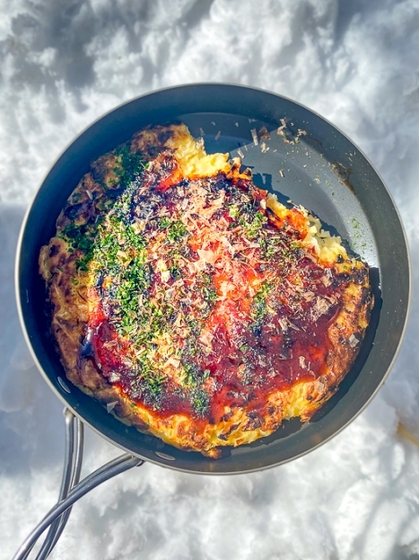 あぁ~ぁ、カラダもお好み焼きも雪まみれ