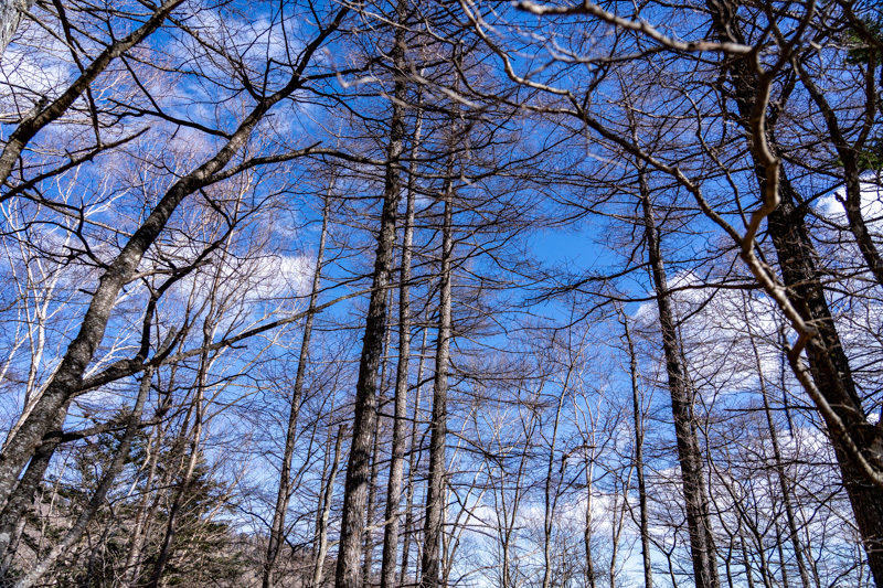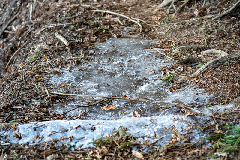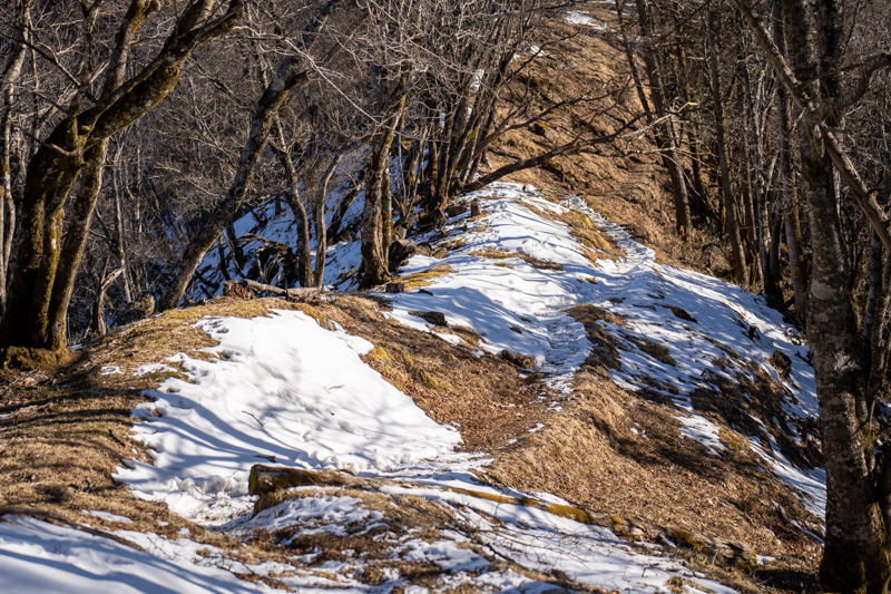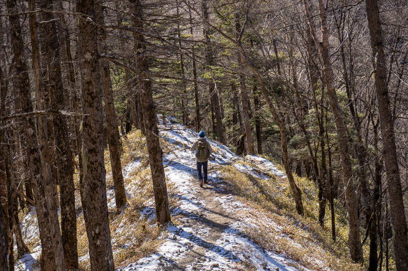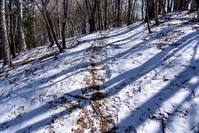 昨年末は霧氷に輝いていたトレイルも、今日はもう春を待ってるカンジ