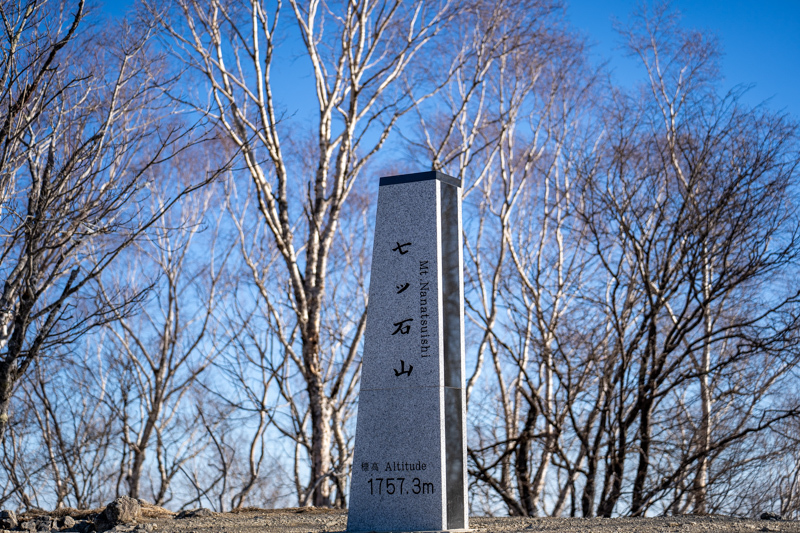 裸木に囲まれただけの七ツ石山頂