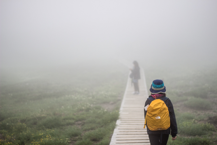 と、こぼしながら人気の無い木道を進むと、一瞬の風で霧が晴れた