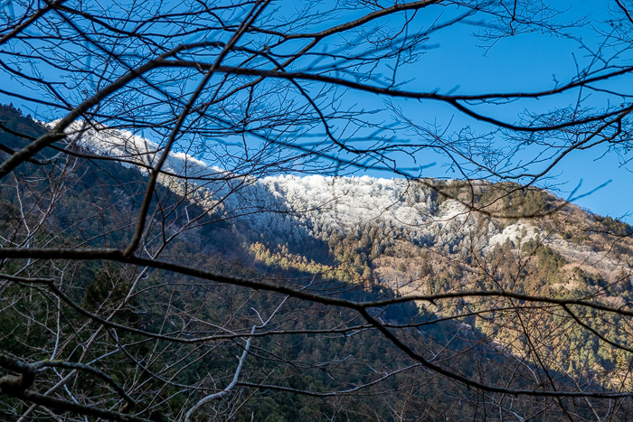 期待まんまんで大又集落へと進むと、林道から見える稜線の一部は白く光っていた