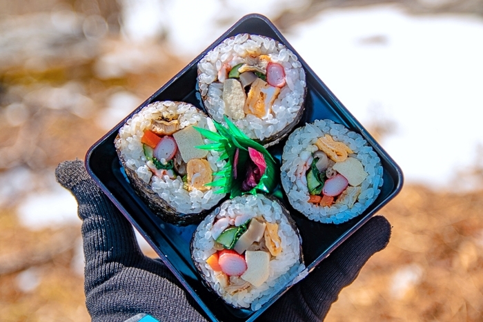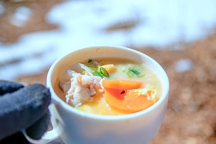 なんて笑いながら、今回もご岳友ルネさんお手製、具沢山な豚汁と恵方巻きを頂く