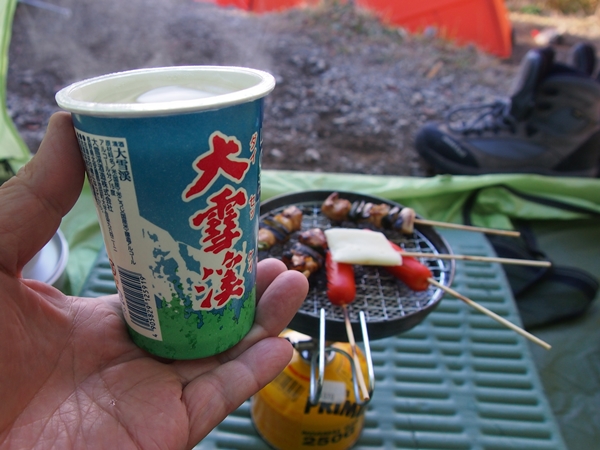 テントを設営すると、先ずは缶ビアで乾杯