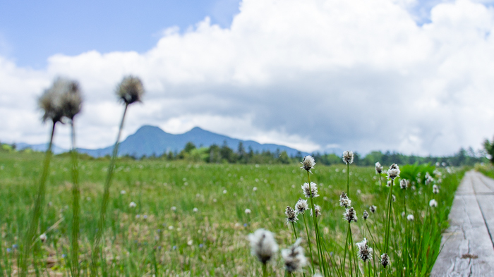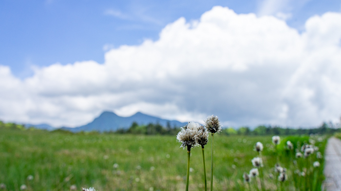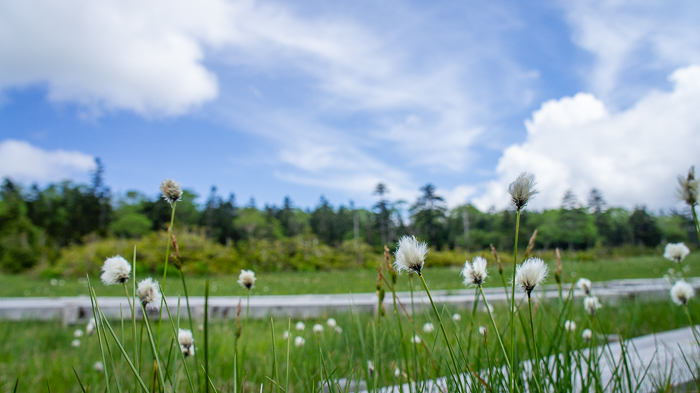 目も覚めるような青空と、ガスに浮く木道とワタスゲ