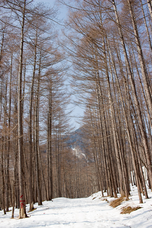 林道のカーブ地点からカラマツ林へと踏み入って行く