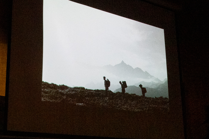 スライドには「黒部の山賊」の奥付にあった山賊たちの画像から