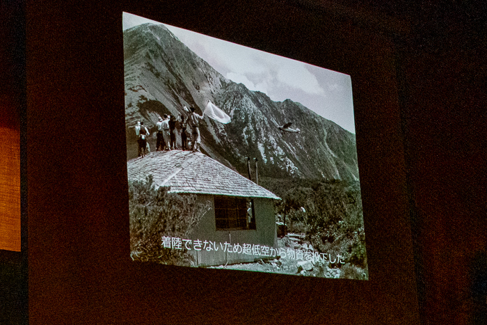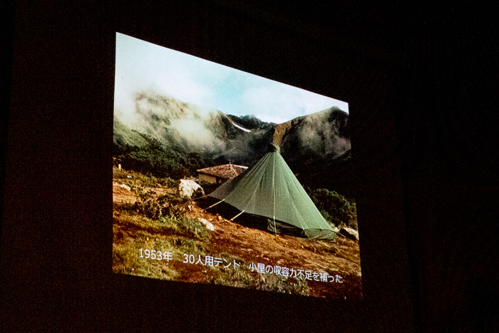 食堂に下ろされた小さなスクリーンの前に立つ小屋番さんが