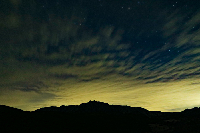不思議な残照の明るさに浮かぶ黒部の山影を