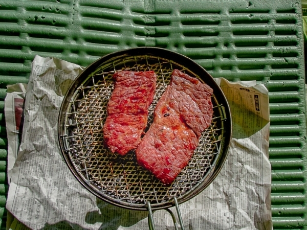 今日の山ごはん 牛肉を炙って喰らう
