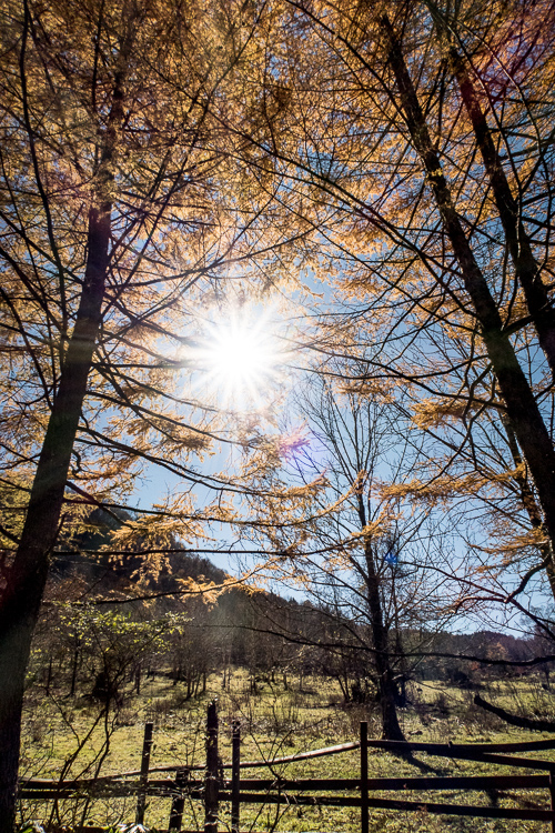 凍て付いた林道は、最後の秋の陽を浴びて黄金色に輝き