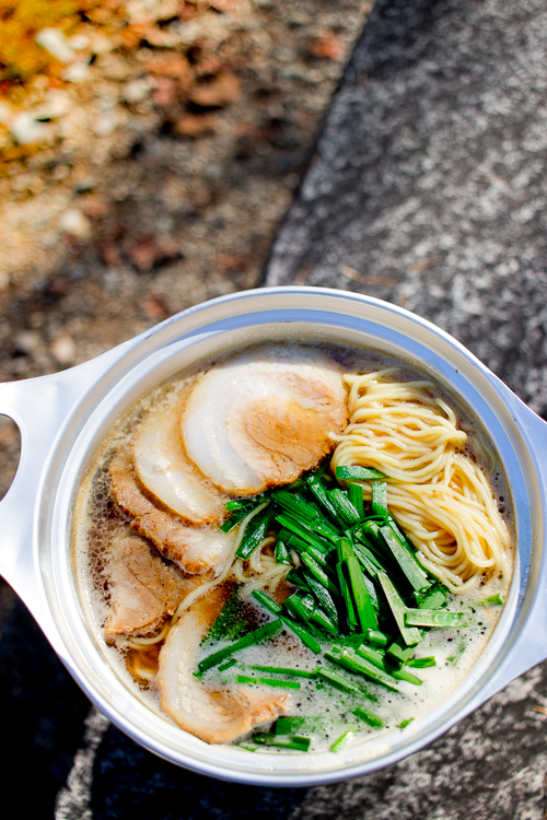 小屋の前でガスと鍋を出してランチ